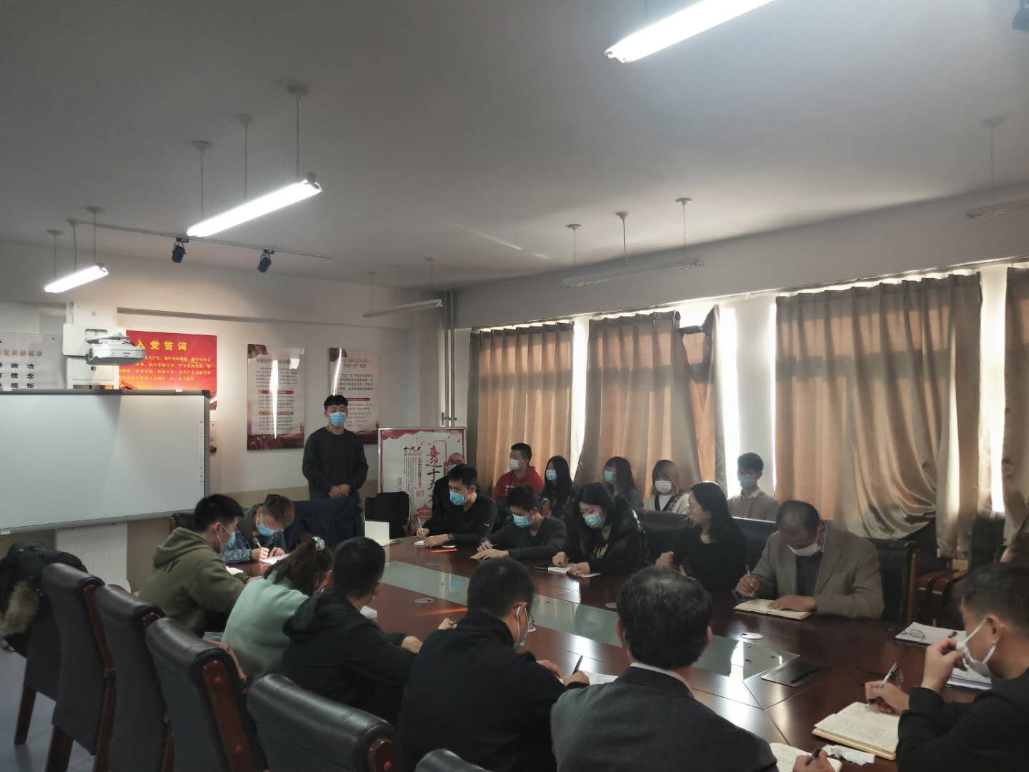2020年11月10日,我校党委副书记魏晓东同志深入建筑与测绘工程学院党支部、学生班级,调研思想动态、倾听学生意见建议。座谈会上,魏晓东副书记与定点联系的党支部党员代表和工程造价1832的学生代表,围绕学生党员先锋模范作用的发挥,以及学生学习、生活、就业、思想状况等内容进行交谈。学生工作处处长梁文学、建筑与测绘工程学院党总支书记王强、院长李长青、党总支副书记任长顺、副院长张丽丽、学生党支部书记林忠华以及工程造价1832班主任马梓超出席座谈会,座谈会由学生党支部书记林忠华同志主持。