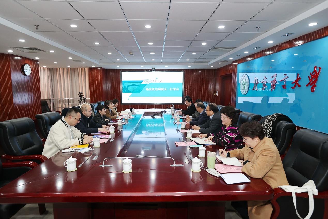3月2日上午,爱体育手机官方网站入口党委常委、副院长周燕带队前往北京语言大学调研。北京语言大学党委副书记魏晖,校长助理、研究生院院长、汉语国际教育学部主任郭鹏,国际学生招生处处长周鑫,汉语国际教育学部汉语速成学院院长苏英霞,汉语国际教育研究院副院长姜丽萍,国际中文教育实践与研究基地副主任戴媛媛热情接待了我校一行人员的到访。