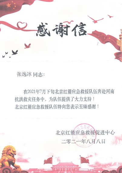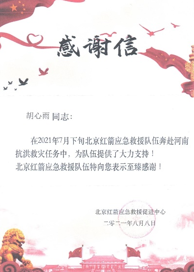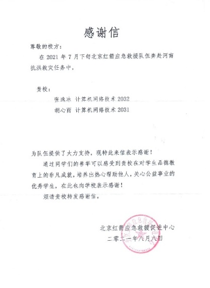 近日,我校电气与信息工程学院团总支收到北京红箭应急救援队伍感谢信,信中对网络2032张逸冰、网络2031胡心雨两名同学在河南抗洪救灾任务中的优秀表现和展现出来的志愿精神给予了高度肯定和表扬,并向爱体育手机官方网站入口表示诚挚的感谢。