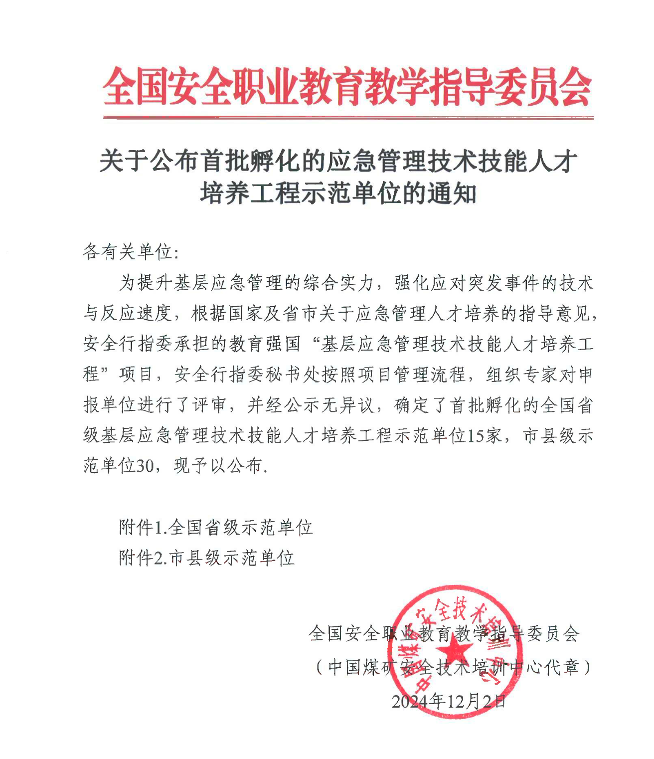 近日,全国安全职业教育教学指导委员会公布“首批孵化的基层应急管理技术人才培养工程示范单位”名单,我校获评首批全国市县级示范单位。该项目为教育部委托全国安全职业教育教学指导委员会实施的教育强国项目,也是我校城市安全学院成立后,依托学院申建的产教融合项目申报获评的首个示范项目。