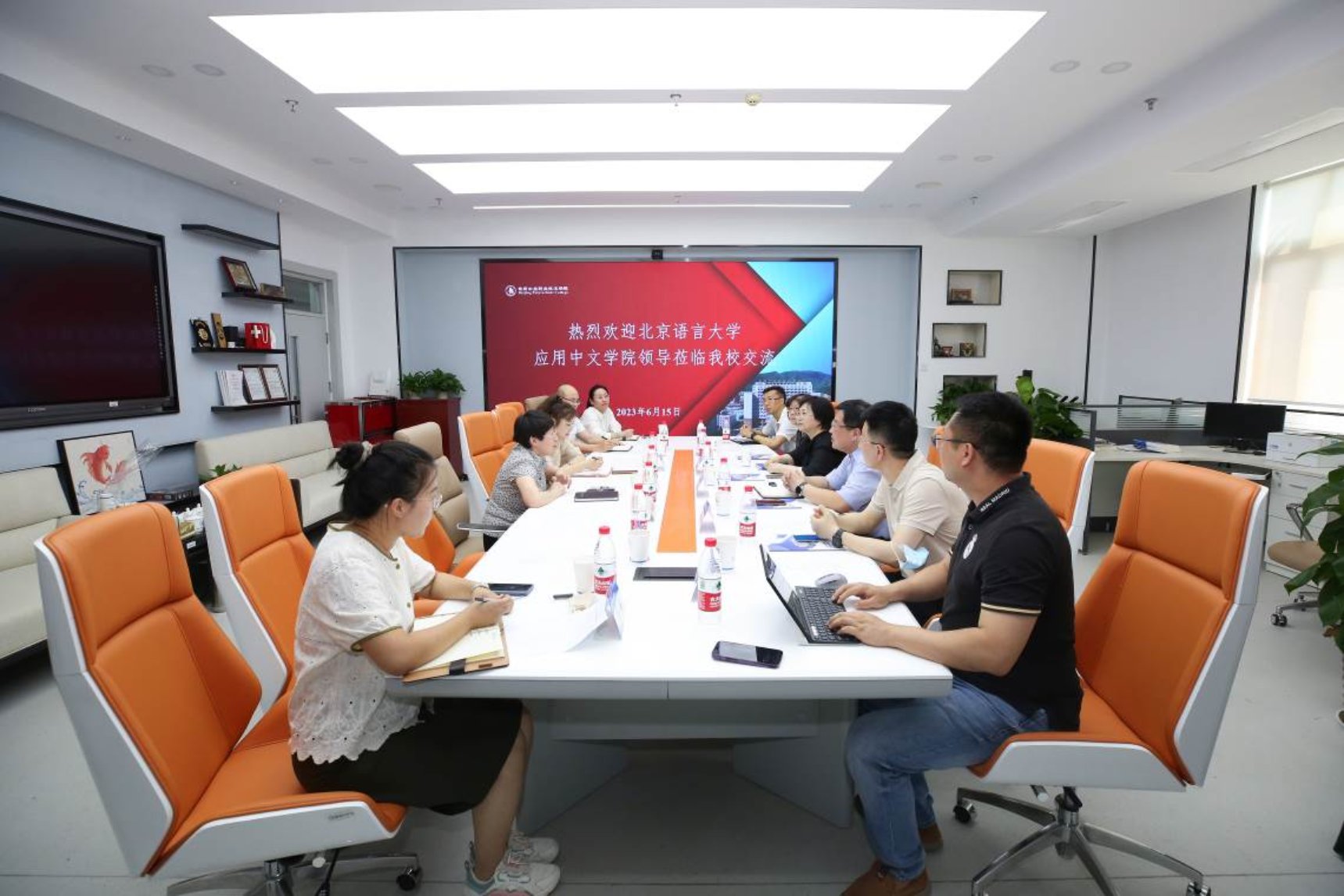 周鑫书记对我校的热情接待表示衷心感谢,并介绍了北京语言大学应用中文学院的基本情况、来访团队和近期发展规划。苏英霞院长简要介绍了应用中文学院的国际中文教学优势,并从教师、教材、教法三方面详细探讨了“中文+职业技能”特色项目的教学内涵建设思路。双方围绕共建的“中文+职业技能”项目这一主题,就签约仪式举办细节、人才培养教学方案设计、教材开发与共建、教科研课题共研及成果产出等教育教学多环节,展开了深入探讨和交流。