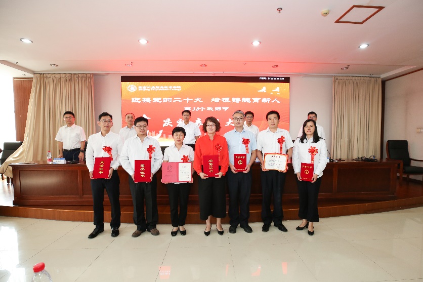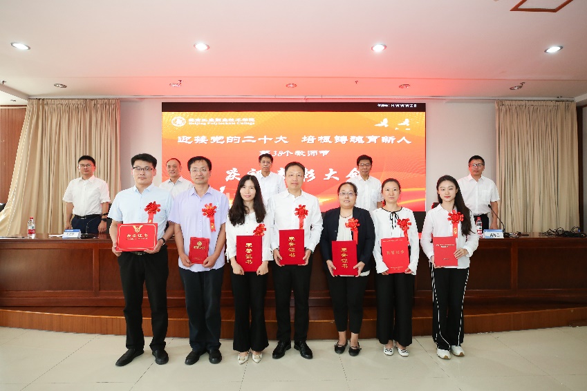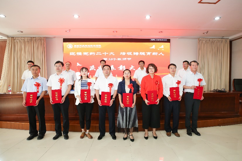 9月9日下午,我校在匠心楼3层报告厅隆重举行第38个教师节庆祝表彰大会。今年教师节的主题是“迎接党的二十大 培根铸魂育新人”。党委书记高喜军同志,党委副书记、院长安江英同志,党委副书记魏晓东同志,党委常委、纪委书记张萌萌同志等出席了大会。参加本次大会的还有中层干部代表、教职工代表及新入职教职工。会议由党委常委、副院长冯海明同志主持。根据疫情防控有关要求,此次庆祝大会按照线上线下相结合的形式进行,部分教职工和学生线上观看大会直播。