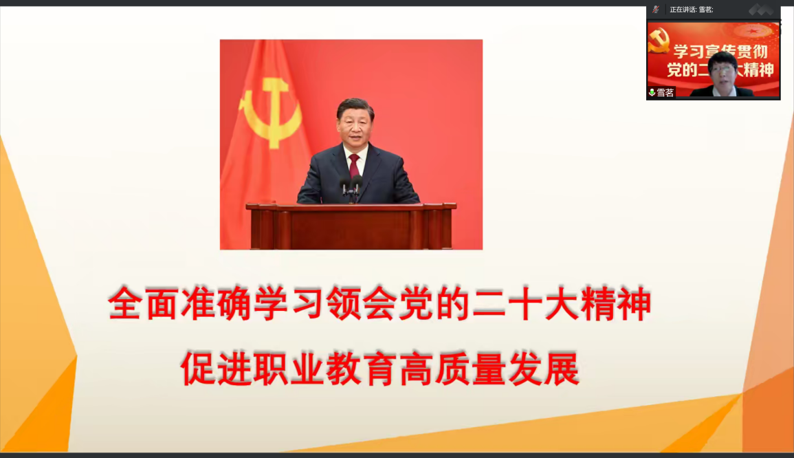 为深入学习宣传贯彻党的二十大精神,12月30日下午,党委常委、副院长周燕以“全面准确学习领会党的二十大精神,促进职业教育高质量发展”为主题作党的二十大精神专题宣讲。图书联合党总支全体党员以及入党积极分子参加此次宣讲活动,宣讲会采用线上形式开展。