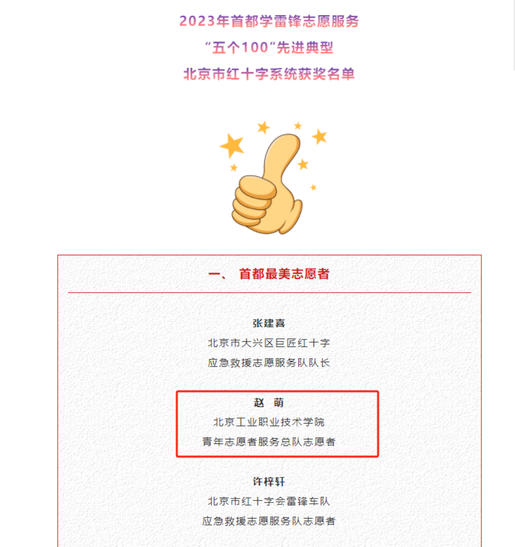 为大力弘扬志愿精神,进一步推进学雷锋志愿服务制度化、常态化,近日,由首都文明委组织开展的2023年宣传推选学雷锋志愿服务“五个100”先进典型名单公布,我校团委副书记赵萌老师荣获“首都最美志愿者”。
