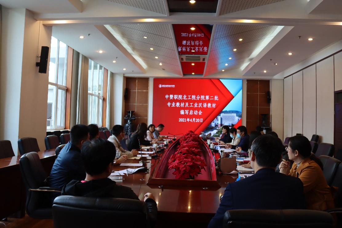 2021年4月20日,中赞职业技术学院北工院分院第二批专业教材编写及工业汉语教材编写启动会在匠心楼第四会议室召开。我校副校长周燕、教务处副处长王军红、国际处副处长谢丽杲、副处长孟晴、专业教材编写负责老师以及国际处相关工作人员参加了会议。国家开放大学出版传媒集团职业教育事业部主任赵杰、策划编辑尤丽娜受邀参加此次研讨会。会议由国际处副处长孟晴主持。