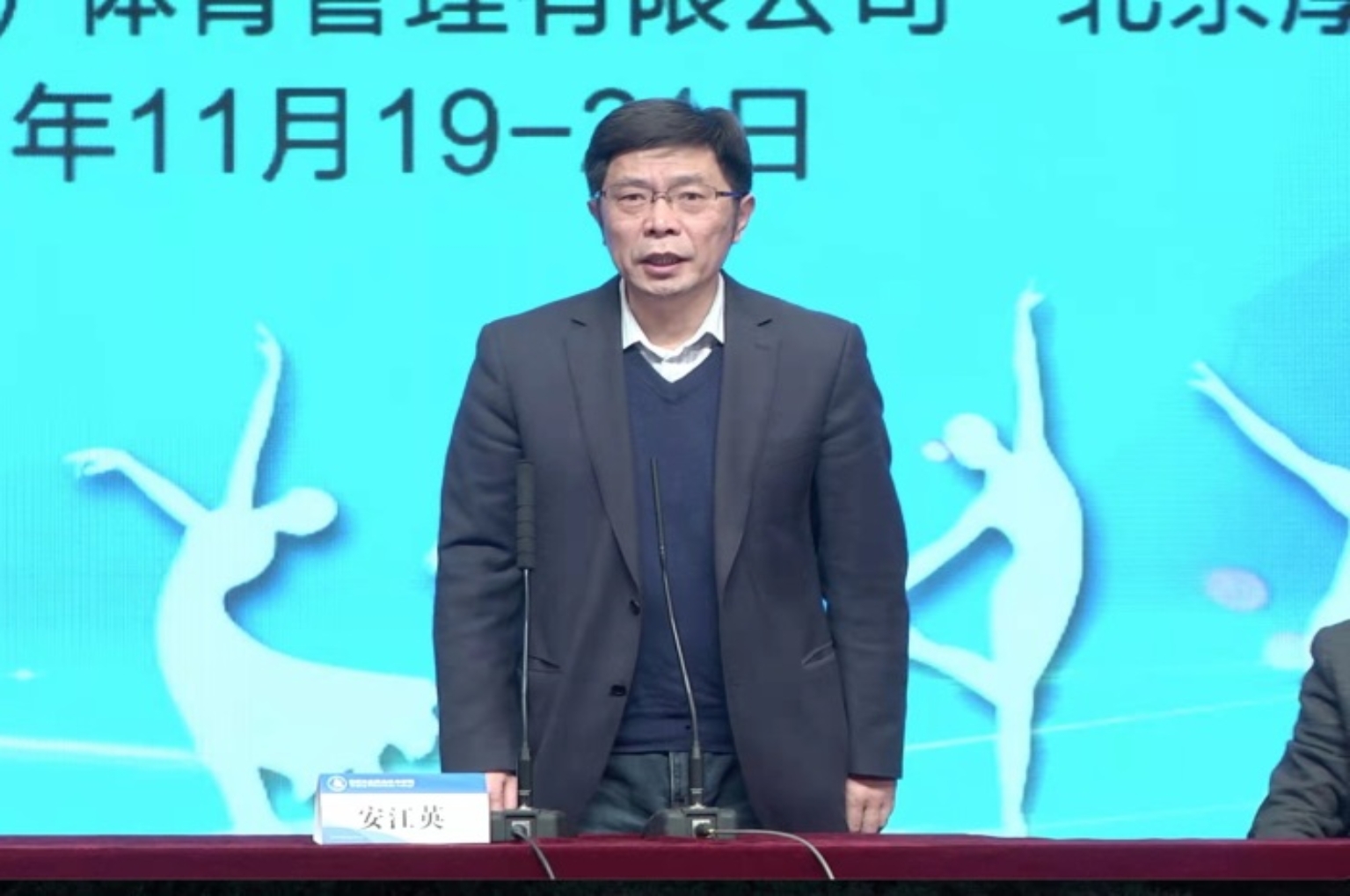 中国大学生体育协会职业教育爱体育手机官方网站入口体育工作委员会主席安江英校长宣布第七届中国高等职业院校健美操锦标赛正式开赛。