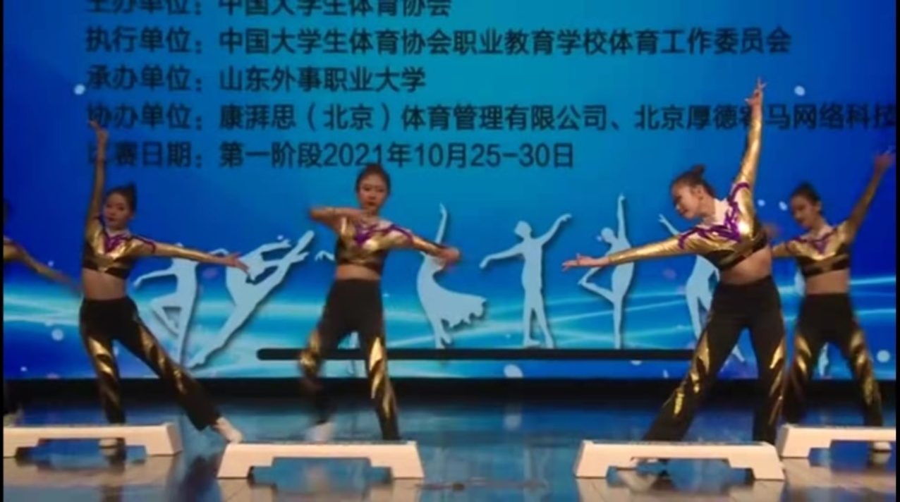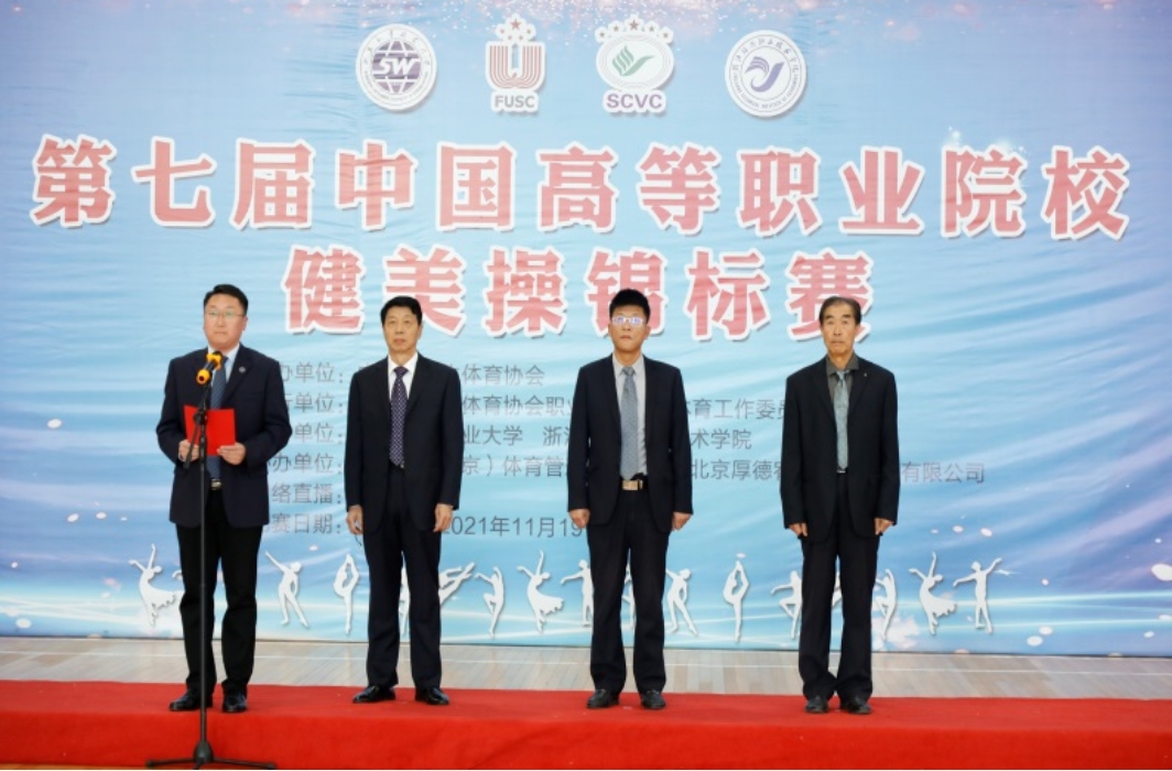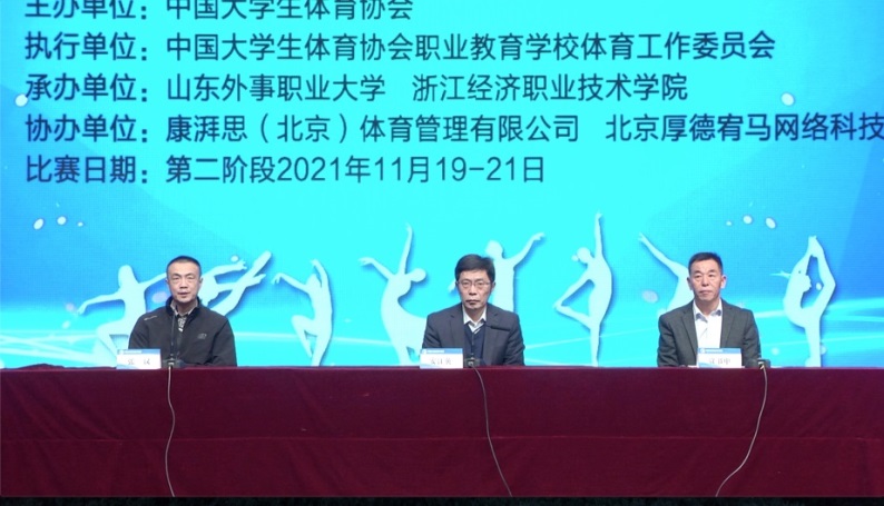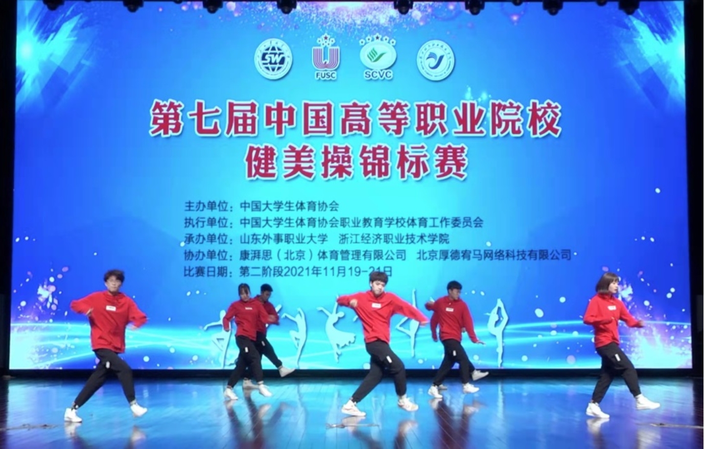 在全国深入学习党的十九届六中全会精神的热潮中,第七届中国高等职业院校健美操锦标赛如期举行。11月20日上午,比赛开幕式同时在我校和山东外事职业大学、浙江经济职业技术学院三地以网络直播方式进行。中国大学生体育协会综合部主任张汉,中国大学生体育协会职业教育爱体育手机官方网站入口体育工作委员会主席、我校校长安江英,秘书长、我校体育部主任贾书申,全国高等爱体育手机官方网站入口体育教学指导委员会公体组副组长胡振浩,山东外事职业大学常务校长刘先义等领导参加开幕式。比赛由中国大学生体育协会主办、山东外事职业大学和浙江经济职业技术学院承办,我校为中国大学生体育协会职业教育爱体育手机官方网站入口体育工作委员会主席单位负责组织执行本届赛事。赛事在菁体育独家网络直播。