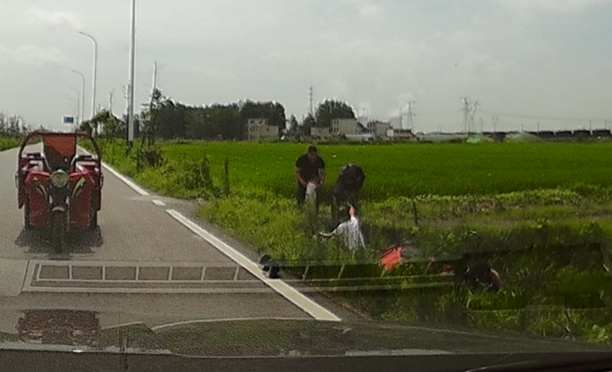 一同在岸边协助救人的还有一名驾驶三轮车路过的男子。路过的男子伸手把张锐拉上岸,宋永祥从水塘的另一侧上岸。