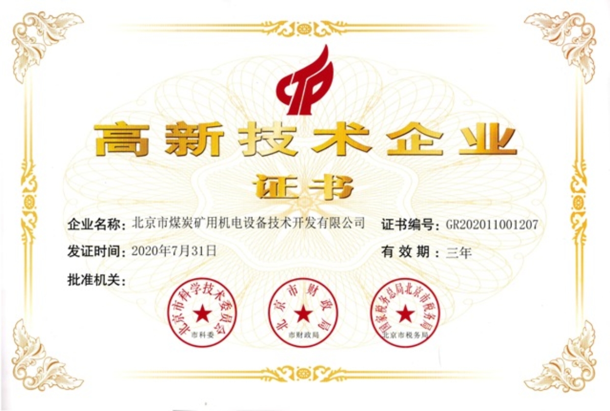 今天,我校企业北京市煤炭矿用机电设备技术开发有限公司(简称“北煤机电”)领到了北京市科委、北京市财政局、国家税务总局北京市税务局联合颁发的2020年《高新技术企业证书》(GR202011001207),这也是我校北煤机电自2008年国家科技部、财政部、国家税务总局联合出台了新的《高新技术企业认定管理办法》后,连续第五次获得的国家高新技术企业认证(GR200811000364、GF201111000360、GR201411000980、201711002394)。