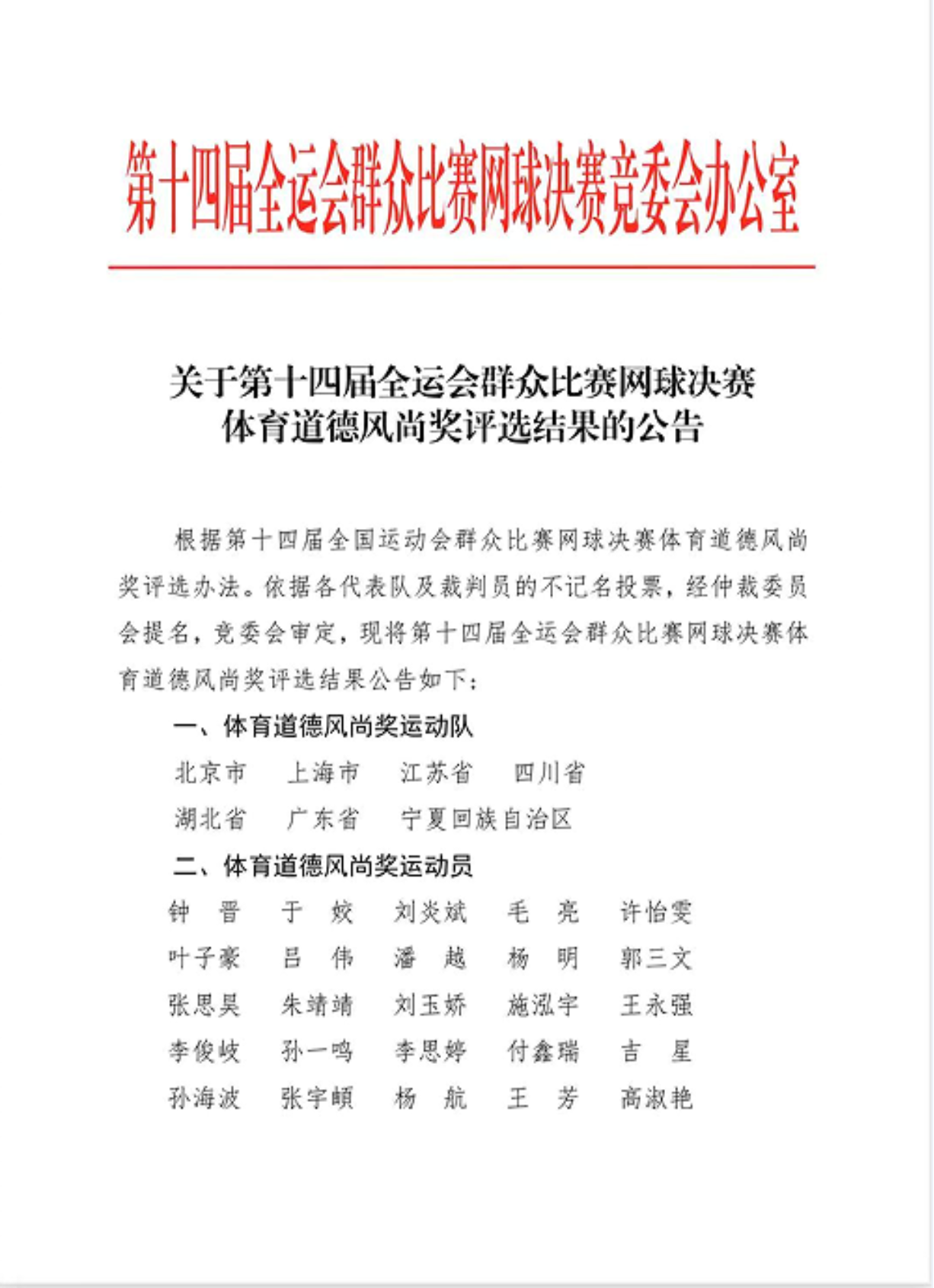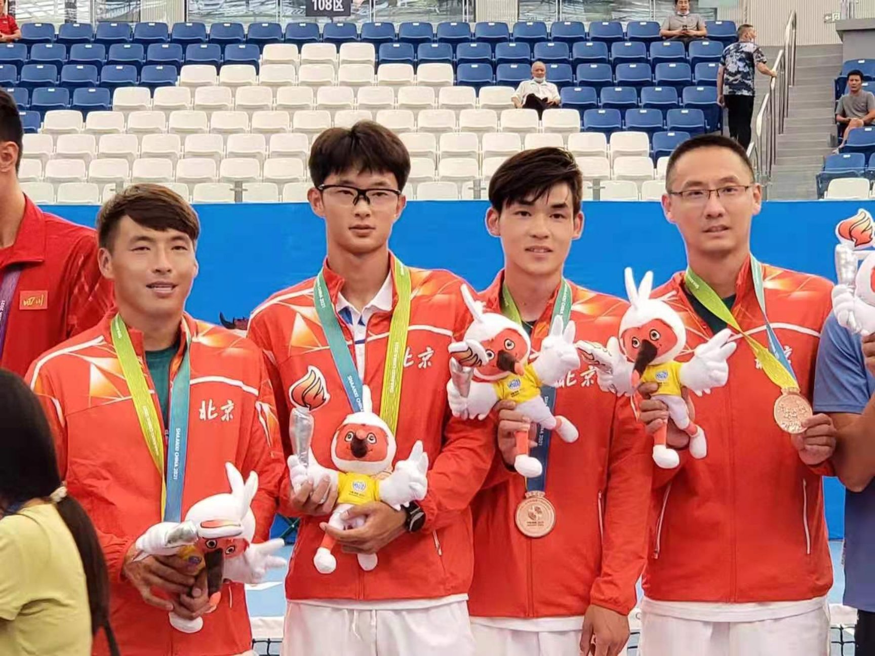 9月16日—25日张宇頔老师和队友共同努力,经过多场激烈的比赛,最后,战胜东道主陕西队,为北京市获得了本届全运会群众网球比赛的铜牌,为北京市争得了荣誉,也为我校争得了荣誉。同时,张宇頔老师作为主力队员,表现优异,获得了“第十四届全运会体育道德风尚奖”,取得了运动成绩和精神文明双丰收。
