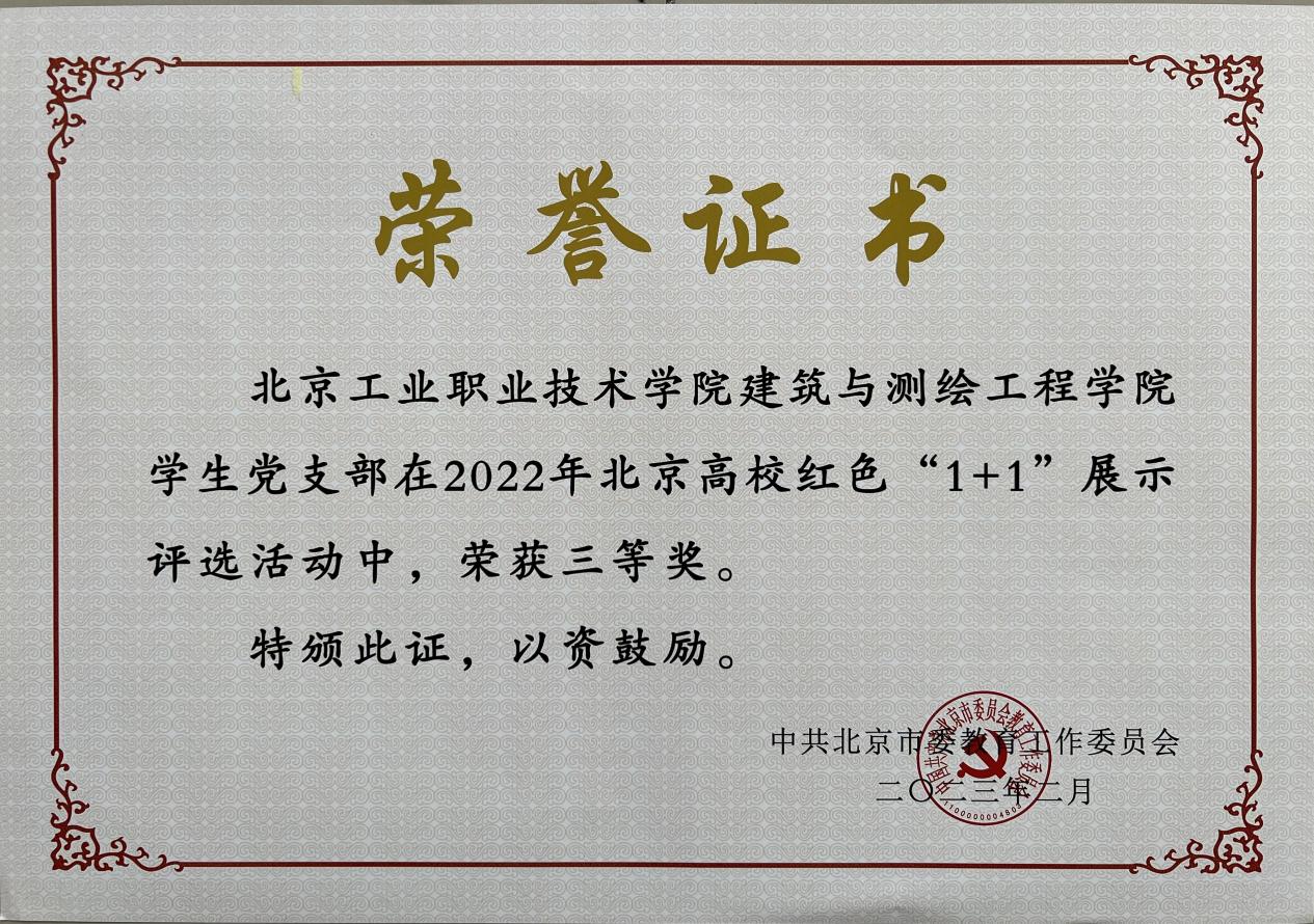 由北京市委教育工委举办的2022年北京高校红色“1+1”展示评选活动刚刚落幕,我校建筑与测绘工程学院学生党支部在此次评选活动中荣获三等奖。