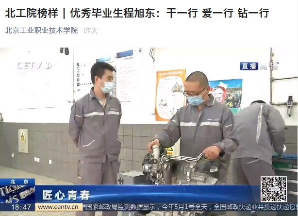 职业教育,是国民教育体系和人力资源开发的重要组成部分,是广大青年打开通往成功成才大门的重要途径。为充分展现我国职业教育成果和“青年工匠”的感人事迹、精湛技能,从5月1日起,中国教育电视台《全国教育新闻联播》栏目推出了“匠心青春”系列报道,展示职教领域练就“绝活儿”的青年能手。5月2日,2021年“首都劳动奖章”获得者,我校优秀毕业生程旭东的事迹在该节目中播出,受到全校师生广泛关注,在师生中引起强烈共鸣。