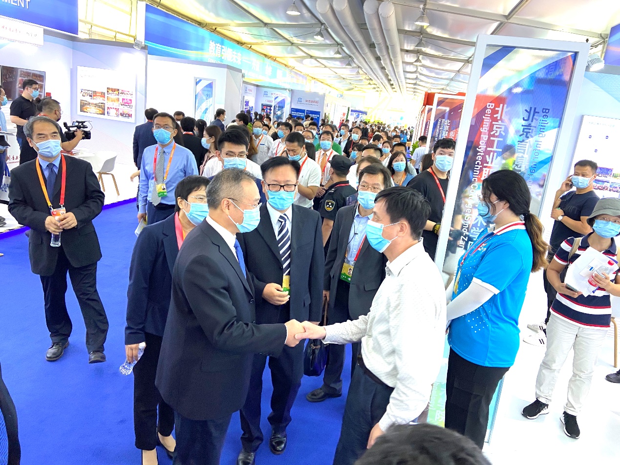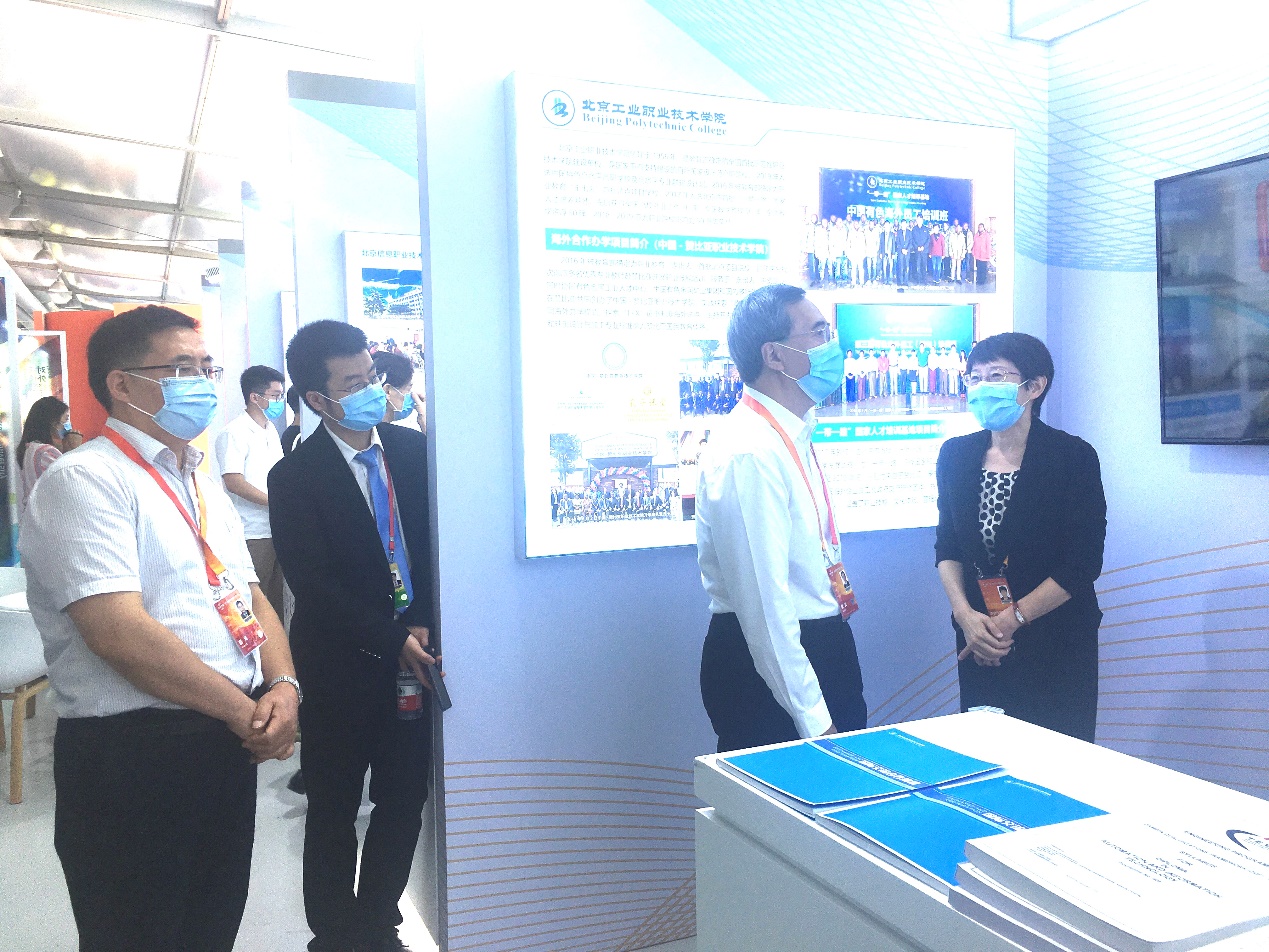 北京市教育委员会主任刘宇辉、一级巡视员黄侃、副主任温涛、北京市国际教育交流中心主任谷天刚一行到我校展台观展指导