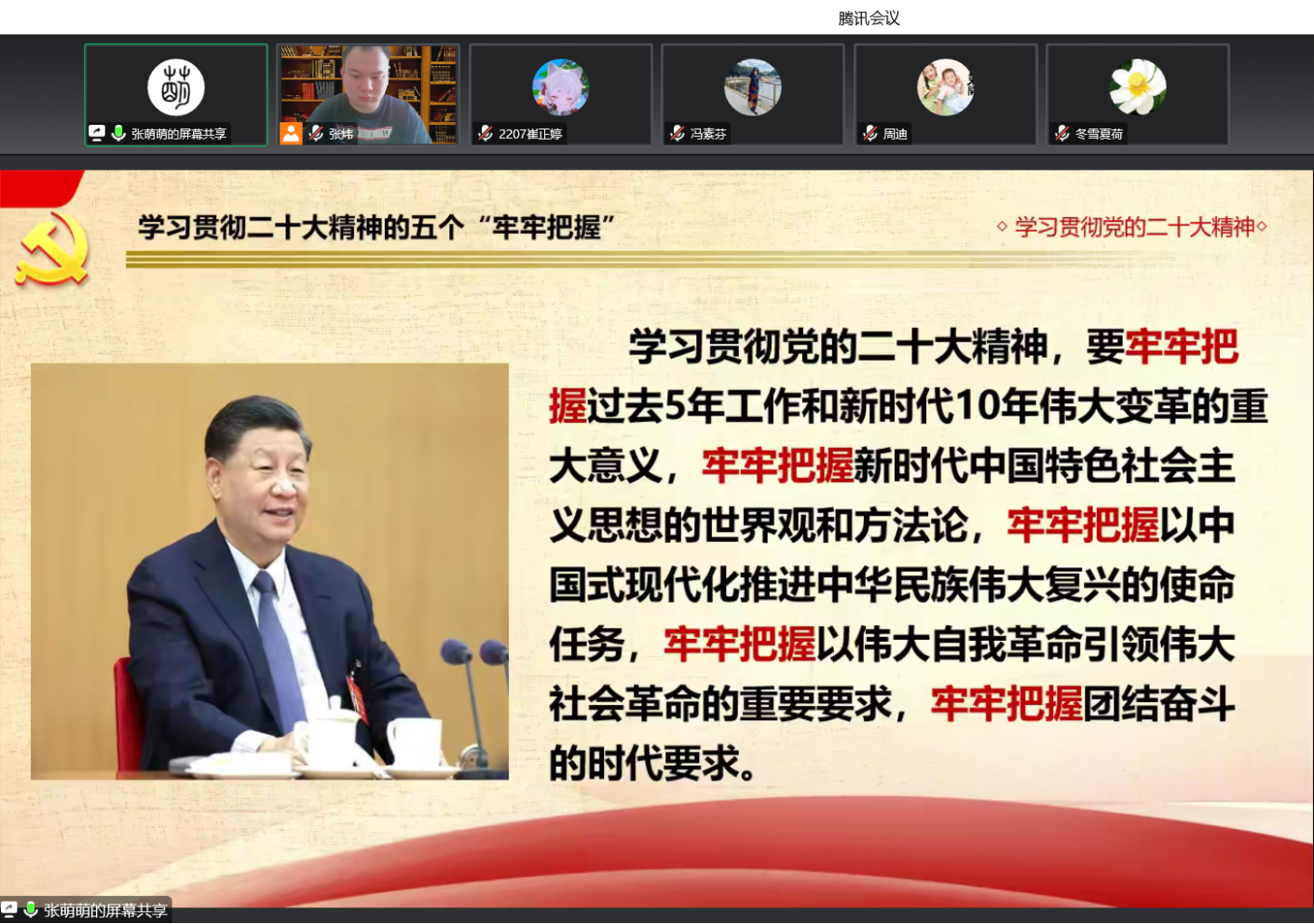 专题报告上,张萌萌书记介绍了党的二十大的召开背景和党的二十大精神主题,从六个方面重点阐述了党的二十大报告的内容。强调,要牢牢把握过去5年工作和新时代10年伟大变革的重大意义;牢牢把握新时代中国特色社会主义思想的世界观和方法论;牢牢把握以中国式现代化推进中华民族伟大复兴的使命任务;牢牢把握以伟大自我革命引领伟大社会革命的重要要求;牢牢把握团结奋斗的时代要求以及党的二十大报告的其他创新点。