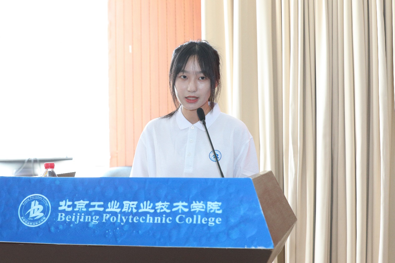 “北工院语文学会赴宁夏推普助力乡村振兴服务队”负责人造价2071班张煜瑶作为大学生暑期社会实践团学生代表讲述了团员青年们立志做有理想、敢担当、能吃苦、肯奋斗的新时代好青年的决心,并代表即将出征的同学承诺,在老师指导下,以谦虚的态度向广大人民群众学习在实践中了解国情民生,在实践中锻炼自我,增强技能,提高服务本领。