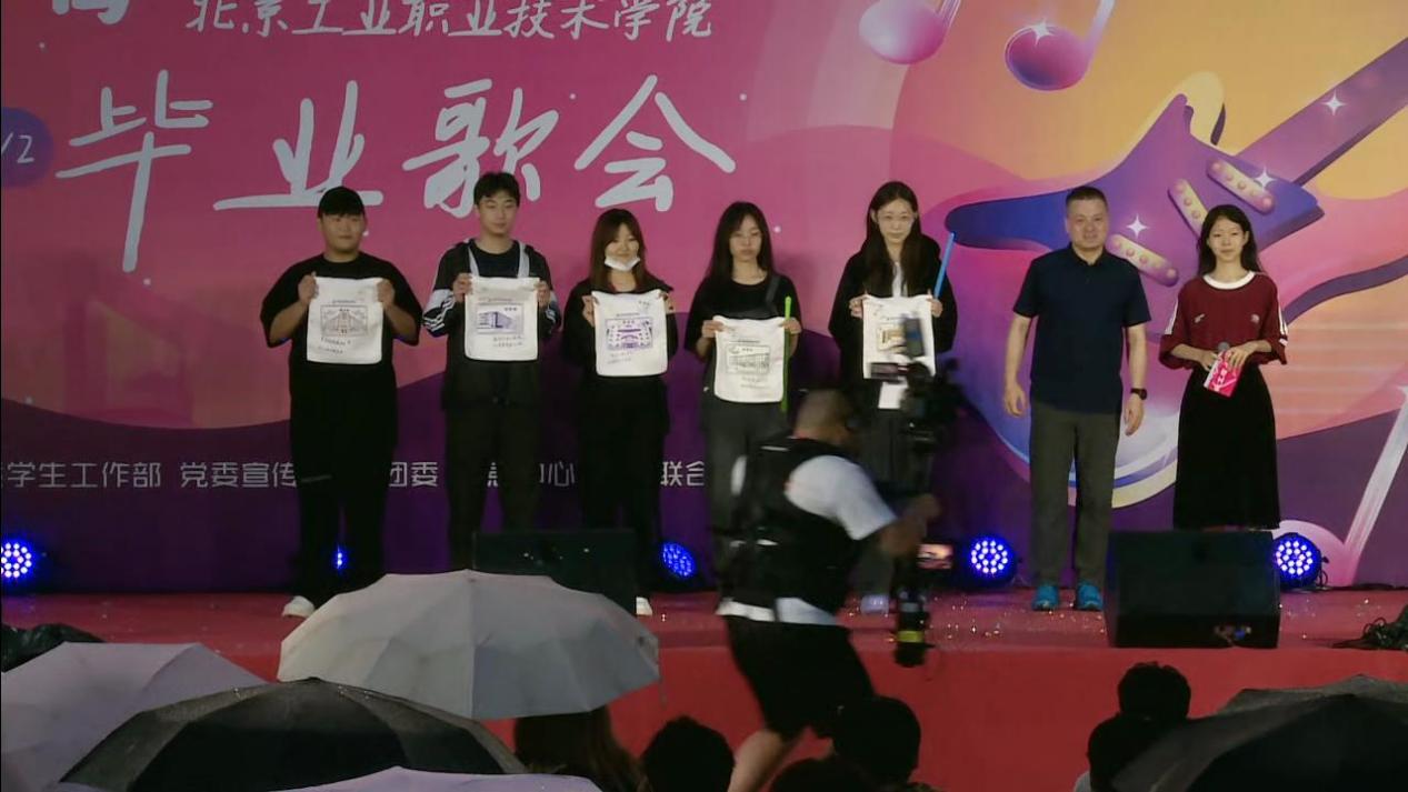 校党委学生工作部部长梁文为幸运观众颁发北工院“落日毕业歌会”周边