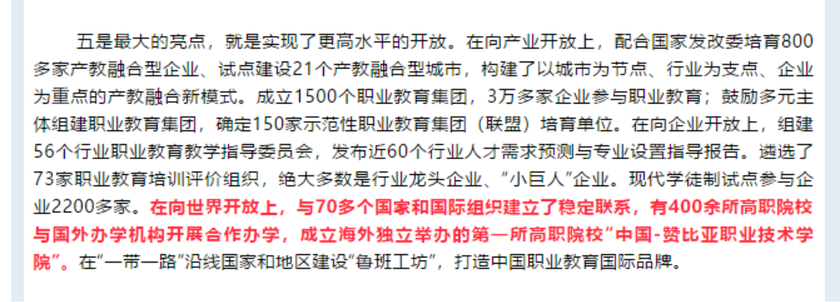 五是最大的亮点,就是实现了更高水平的开放。在向产业开放上,配合国家发改委培育800多家产教融合型企业、试点建设21个产教融合型城市,构建了以城市为节点、行业为支点、企业为重点的产教融合新模式。成立1500个职业教育集团,3万多家企业参与职业教育;鼓励多元主体组建职业教育集团,确定150家示范性职业教育集团(联盟)培育单位。在向企业开放上,组建56个行业职业教育教学指导委员会,发布近60个行业人才需求预测与专业设置指导报告。遴选了73家职业教育培训评价组织,绝大多数是行业龙头企业、“小巨人”企业。现代学徒制试点参与企业2200多家。在向世界开放上,与70多个国家和国际组织建立了稳定联系,有400余所高职院校与国外办学机构开展合作办学,成立海外独立举办的第一所高职院校“中国-赞比亚职业技术学院”。在“一带一路”沿线国家和地区建设“鲁班工坊”,打造中国职业教育国际品牌。