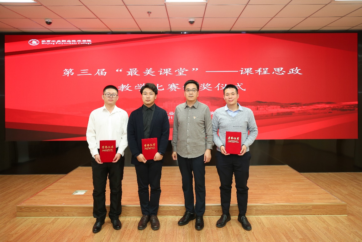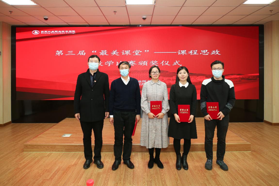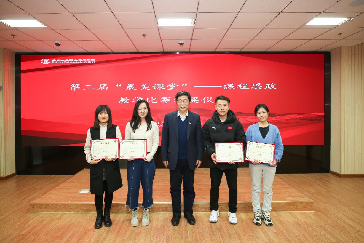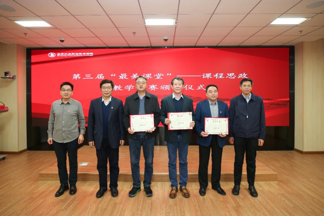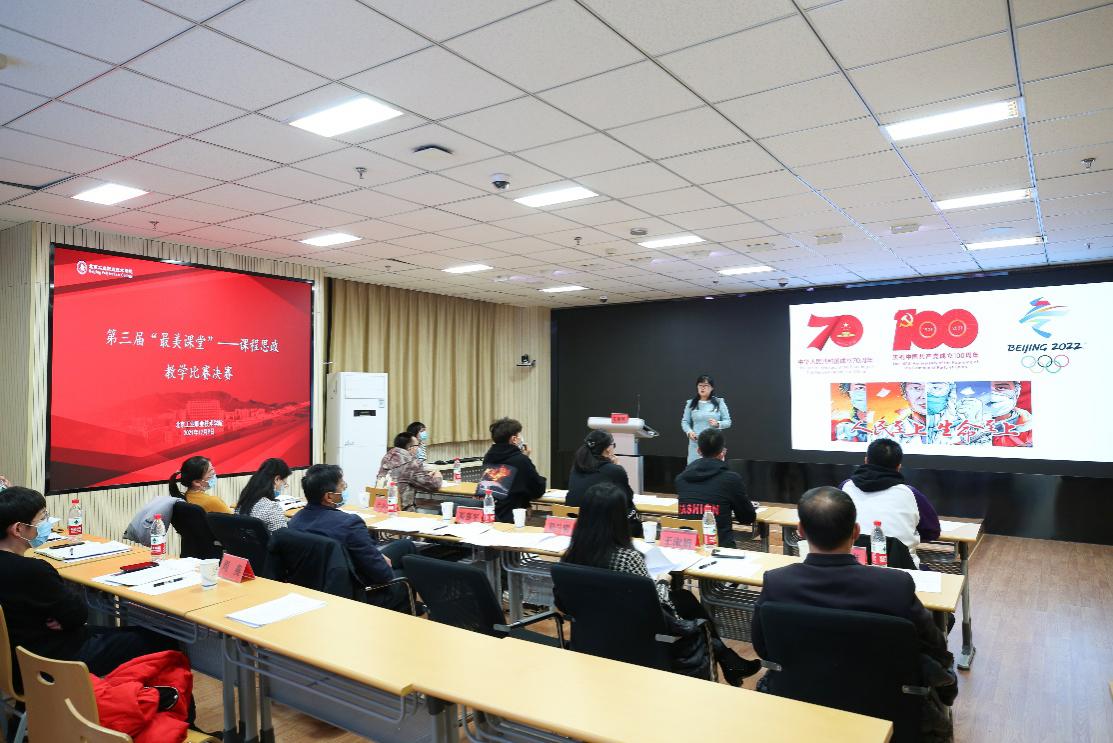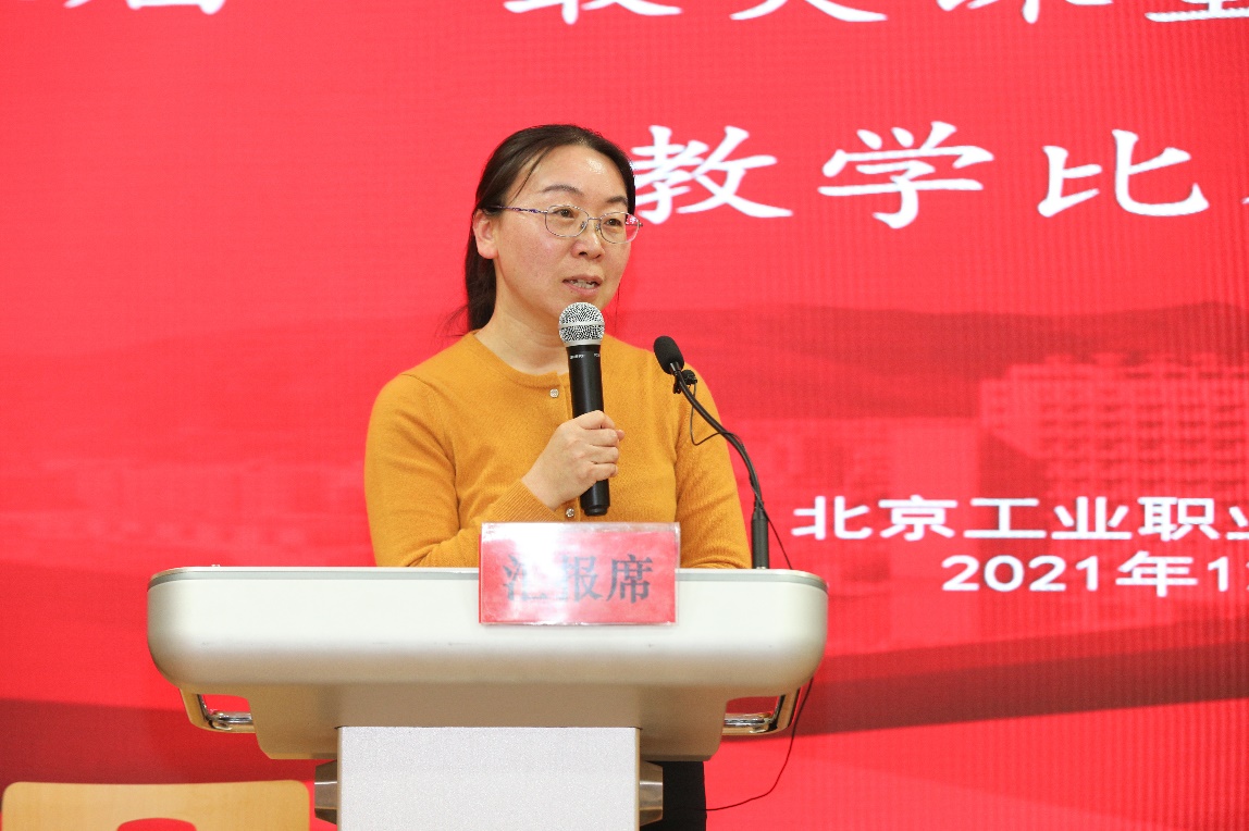 为持续深入落实全国高校思想政治工作会议精神,进一步推进“课程思政”教学改革,健全“三全育人”体系,落实立德树人根本任务。12月9日,我校在匠心楼212举办了第三届“最美课堂”——课程思政教学比赛决赛。本次比赛由教务处、宣传部、马克思主义学院、教学质量监控中心、教师发展中心共同组织。党委书记高喜军、校长安江英、副校长周燕、副校长刘兰明等校领导和相关职能部门负责人、教师代表、学生代表现场观摩了比赛。比赛邀请了北京教育科学研究院职业教育研究所副所长吕良燕、北京教育学院教育管理系主任王淑娟、北京市教科院职业教育研究所教研员刘海霞、北方工业大学中国近现代史纲要教研室主任李肖4位校外专家作为专家评委,五院各推荐1位学生作为学生代表评委。比赛由教务处副处长王军红主持。