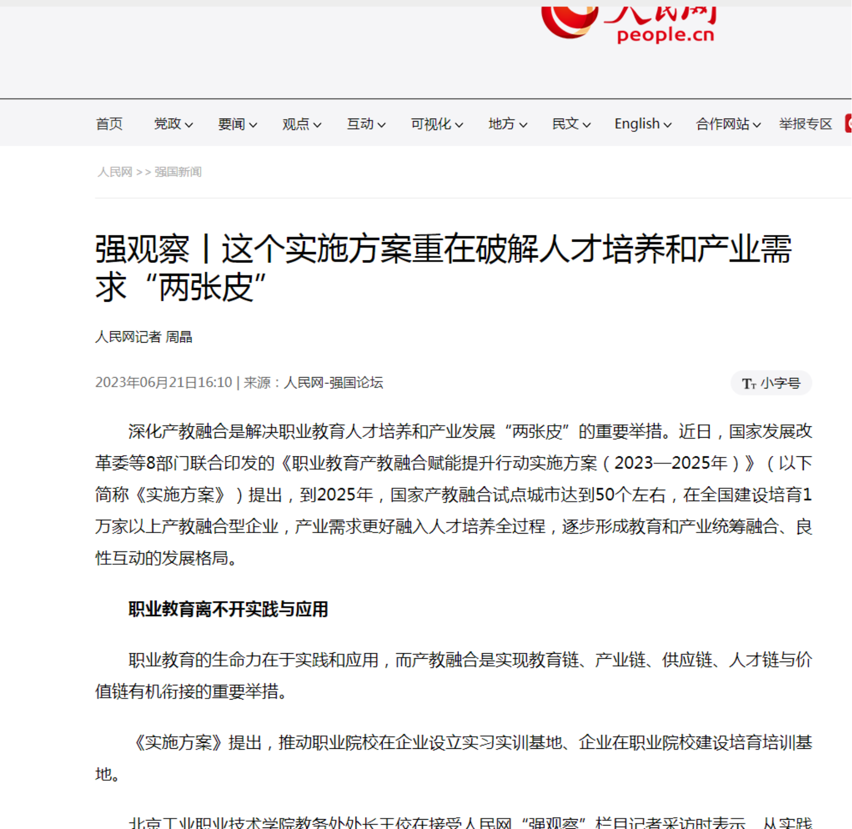 近日,国家发展改革委等8部门联合印发的《职业教育产教融合赋能提升行动实施方案(2023—2025年)》(以下简称《实施方案》)提出,到2025年,国家产教融合试点城市达到50个左右,在全国建设培育1万家以上产教融合型企业,产业需求更好融入人才培养全过程,逐步形成教育和产业统筹融合、良性互动的发展格局。我校教务处处长王佼教授接受人民网“强观察”栏目记者采访,就这个实施方案重在破解人才培养和产业需求“两张皮”的问题进行探讨。