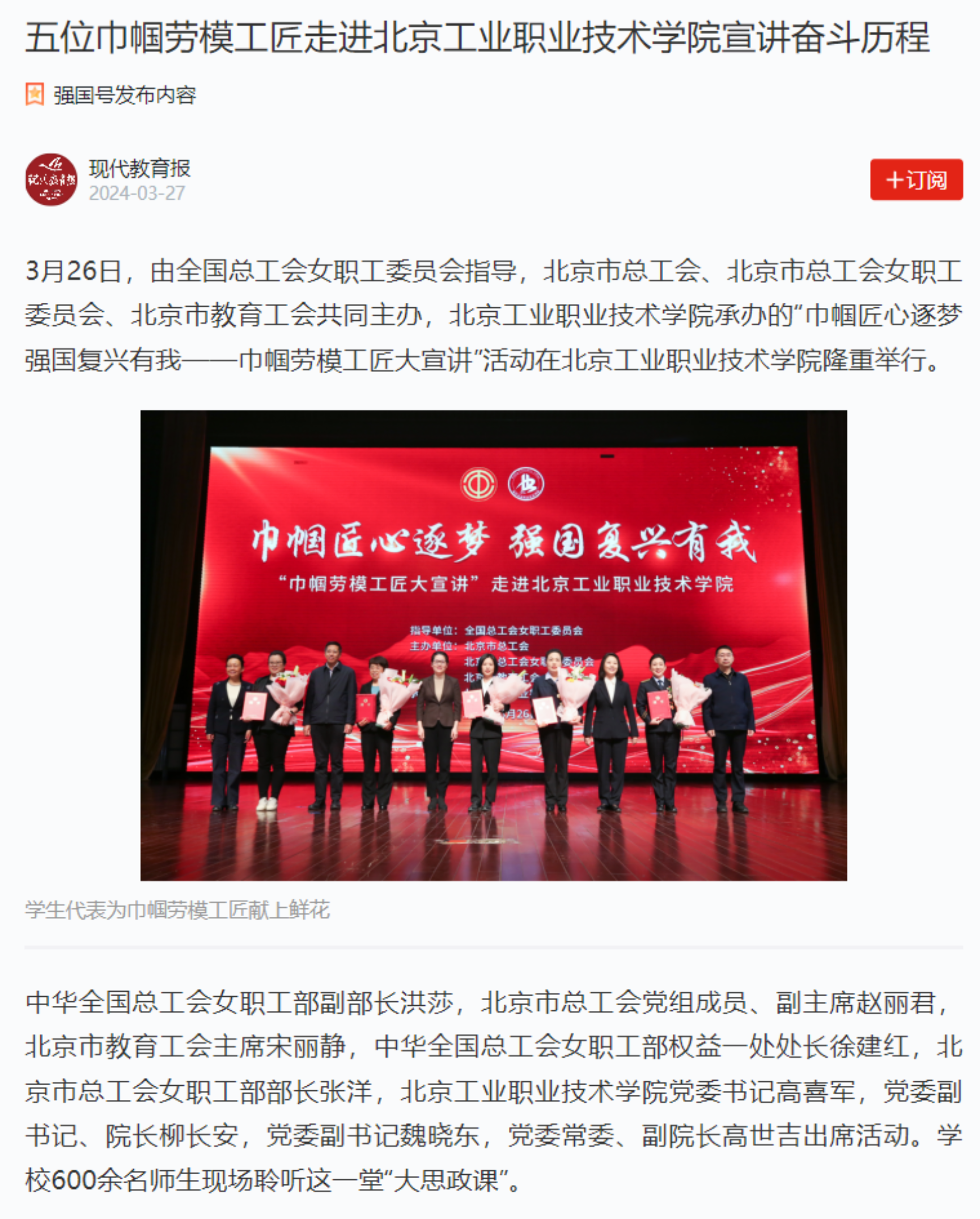 近日,“巾帼匠心逐梦 强国复兴有我”巾帼劳模工匠大宣讲活动在我校举行,五位巾帼劳模工匠代表动情讲述了她们诠释劳模精神、劳动精神、工匠精神的奋斗故事,现场600名师生聆听后用热烈掌声向她们表示致敬。《劳动午报》《北京日报》《现代教育报》等媒体纷纷关注报道,学习强国、中工网、今日头条、北京市总工会官网、财经新闻网等进行了转载。