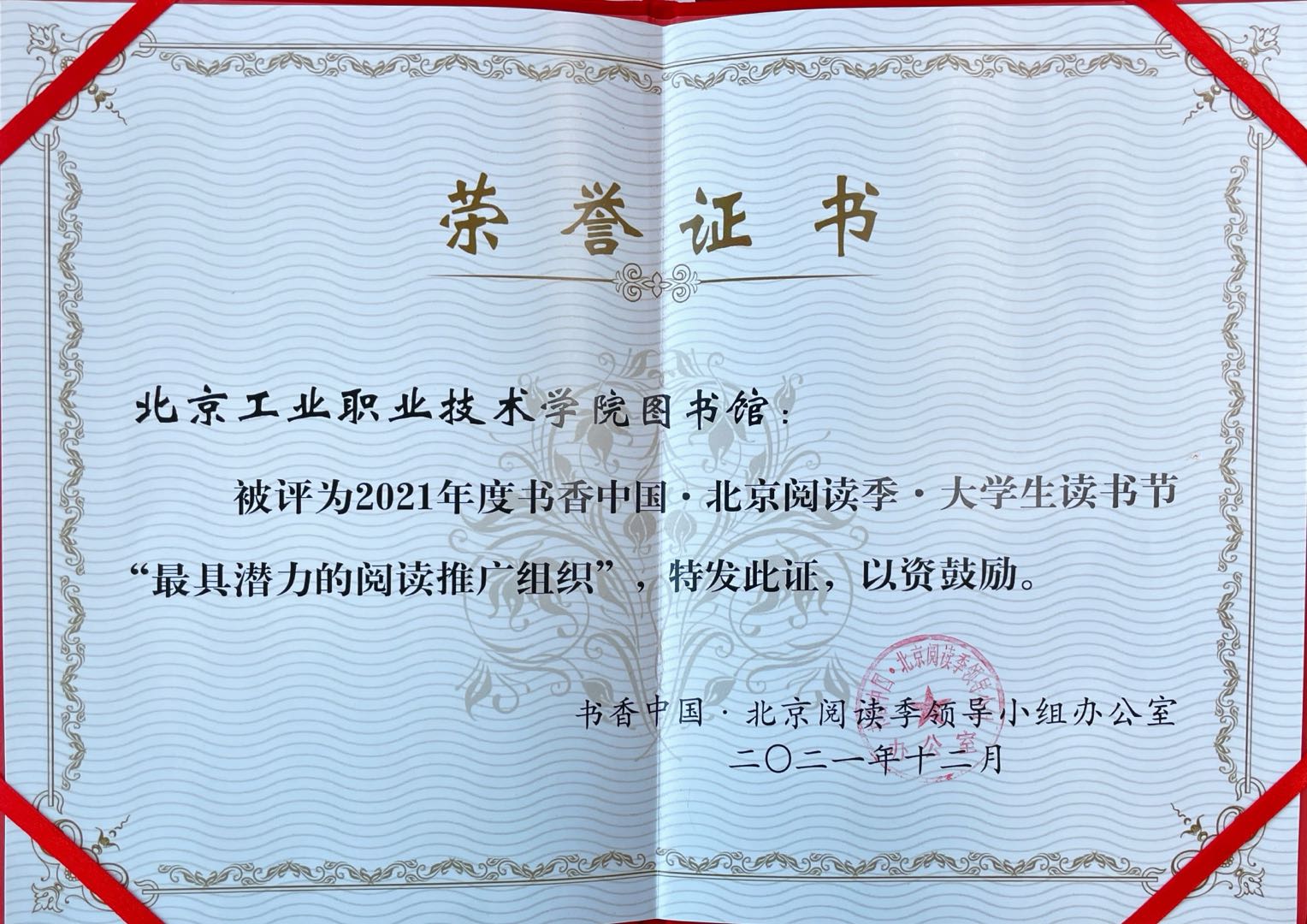 12月19日下午,“书香中国·北京阅读季·大学生读书节”总结会在北京图书大厦报告厅成功举办,我校图书馆被评为2021年度书香中国·北京阅读季·大学生读书节“最具潜力的阅读推广组织”。来自各主办单位的负责人、知名专家学者和来自全市40余所高校的教师和同学代表出席了活动。