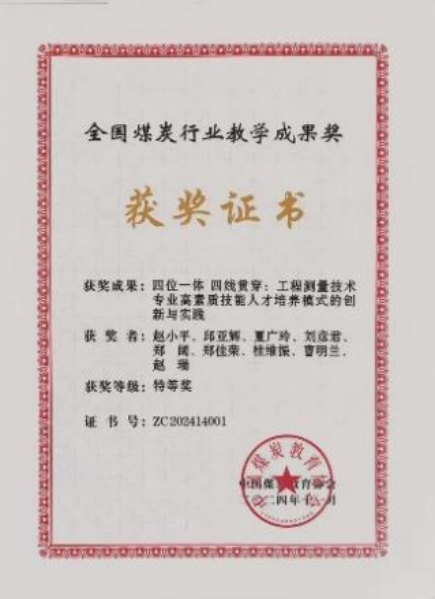 近日,从2024年全国煤炭行业教育教学成果表彰交流大会上传来喜讯,我校在全国煤炭行业教育领域荣膺多项大奖。建筑与测绘工程学院副院长郑阔荣获全国煤炭行业教学名师称号;占文锋教授为带头人的智能建造技术专业教学团队荣获优秀教学团队奖;赵小平教授负责的《四位一体 四线贯穿:工程测量技术专业高素质技能人才培养模式的创新与实践》项目获教学成果特等奖。
