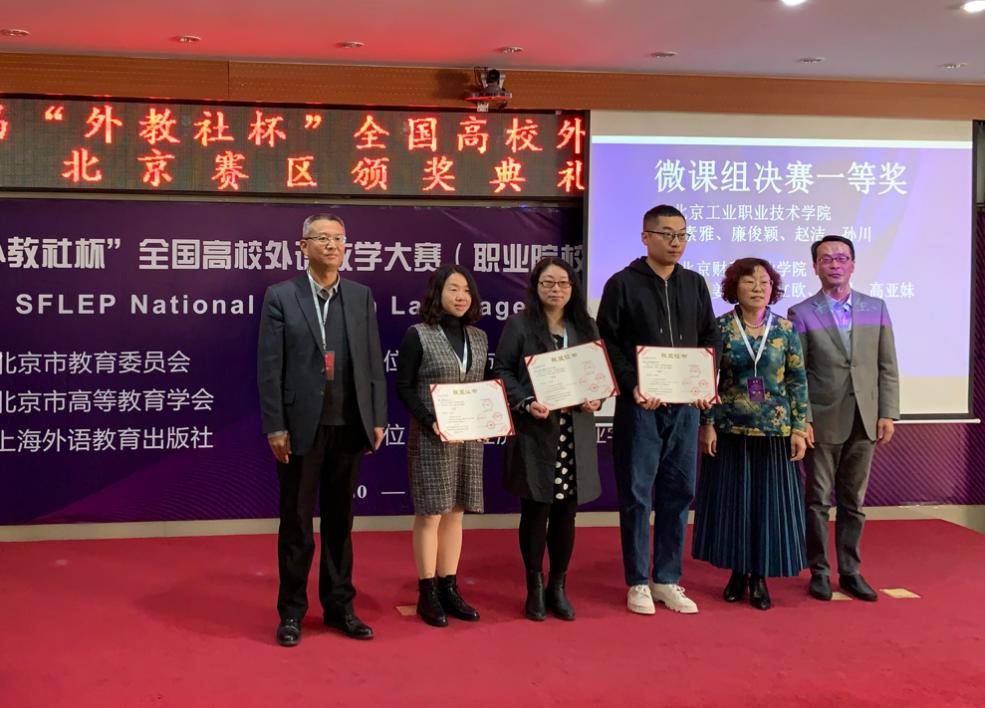 2020年10月25日上午,第十一届“外教社杯”全国高校外语教学大赛(职业院校组)北京赛区比赛在北京经济管理职业学院隆重举行。本次大赛由北京市教育委员会全程指导,北京市高等教育学会、上海外语教育出版社主办,北京市高等教育学会大学英语研究会、北京高校大学英语教育发展中心协办。我校基础教育学院英语教学团队(王素雅、廉俊颖、赵洁、孙川)以第2名的成绩喜获微课组一等奖。