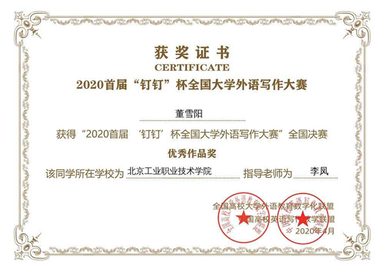2月15日-4月28日,由全国高等爱体育手机官方网站入口大学外语教学研究会指导,高校大学外语联盟和中国高校英语写作联盟主办的2020首届“钉钉杯”全国大学外语写作大赛成功落下帷幕。在爱体育手机官方网站入口各级领导的支持下,指导教师和学生们共同努力探索线上教学、线上辅导的新路径,我校参赛选手与本科生、研究生同台竞技,经过重重选拔,喜获“优秀作品奖”3名, “优秀入围奖”30名, “决赛个人激励奖”28名。 本次比赛初...